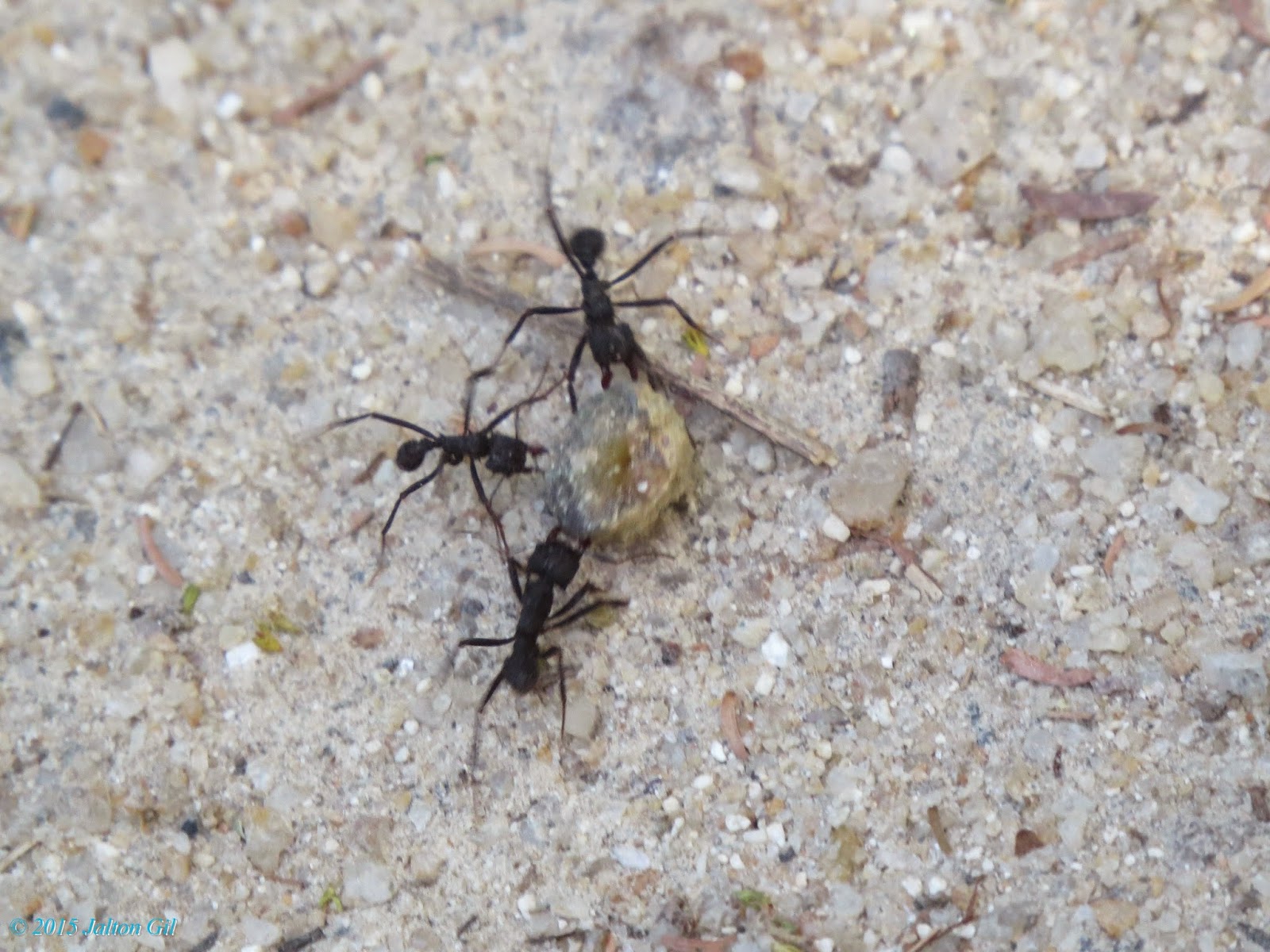 Formigas parecem disputar uma larva no chão.