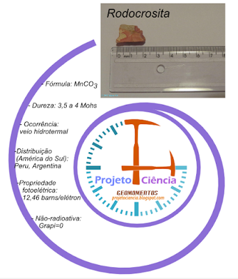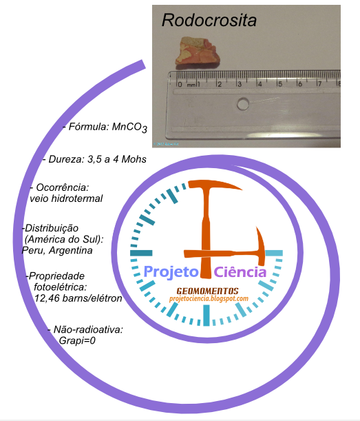 Em comemoração ao Dia do Geólogo (30 de maio) foi lançada a mensagem Geomomentos para estimular a pesquisa bibliográfica sobre o mineral em foco no post. As unidades de medida apresentadas no infográfico não necessariamente pertencem ao SI (Sistema Internacional). Observação: Grapi = Gamma Ray American Petroleum Institute Units. Fontes do Geomomentos - Rodocrosita: Wikipedia (http://en.wikipedia.org), Banco de Dados do Museu "Heinz Ebert" da UNESP (http://www.rc.unesp.br/museudpm/banco/)