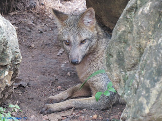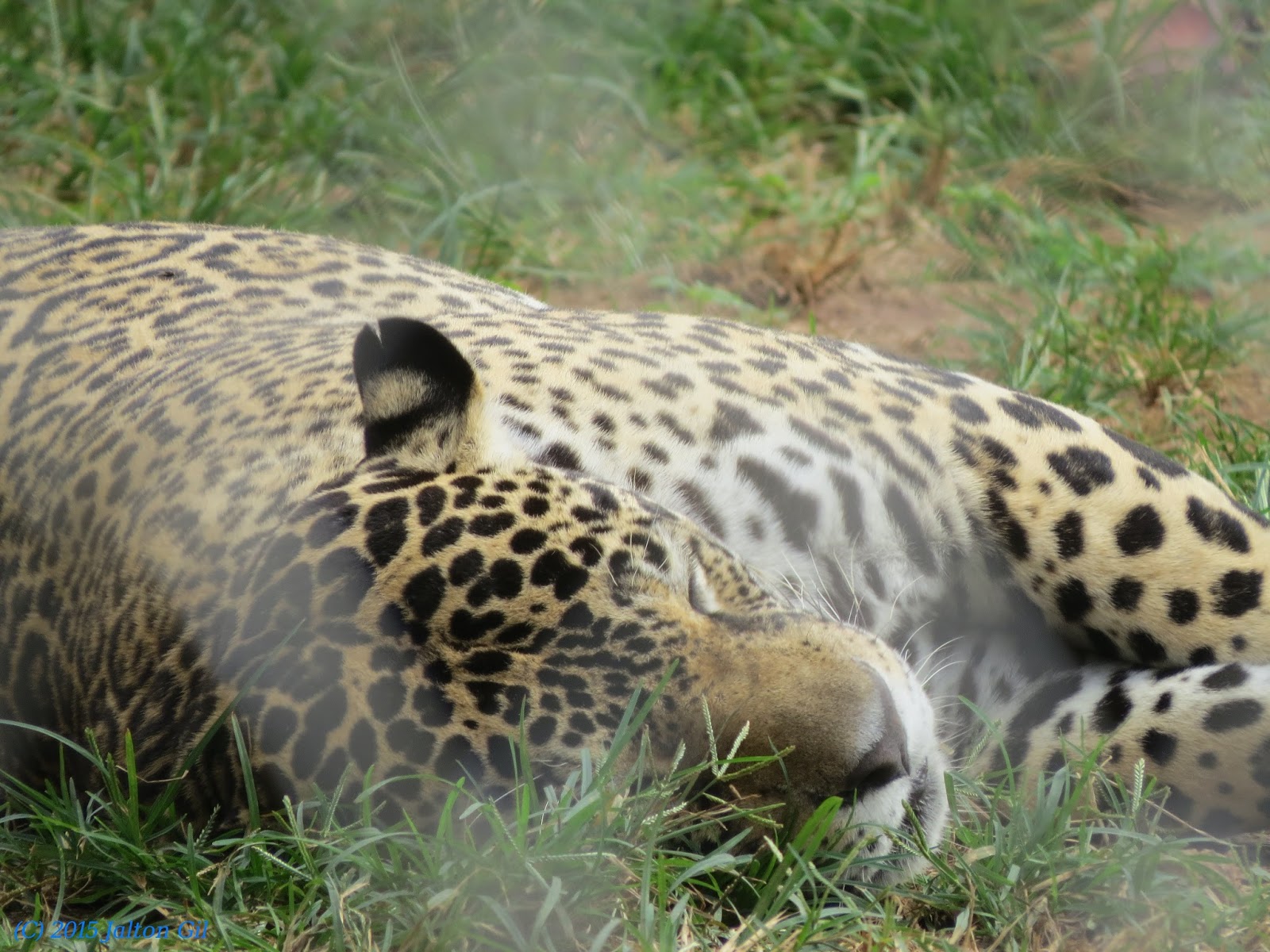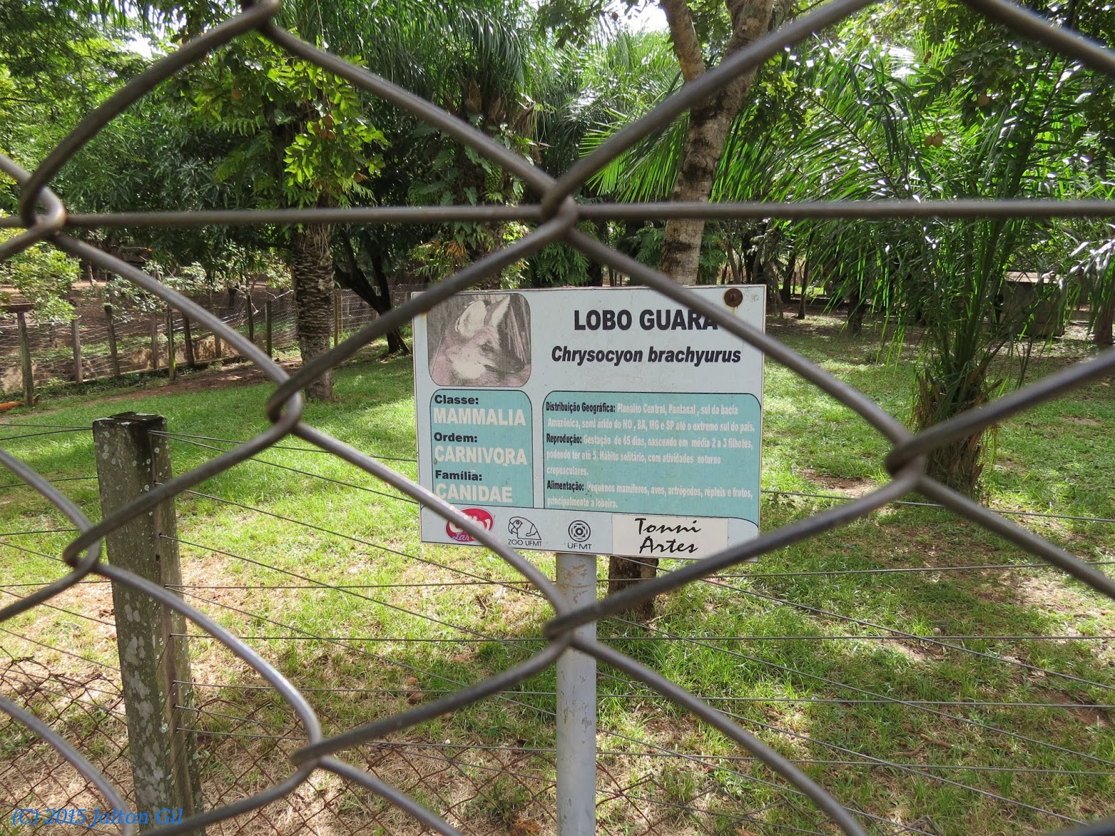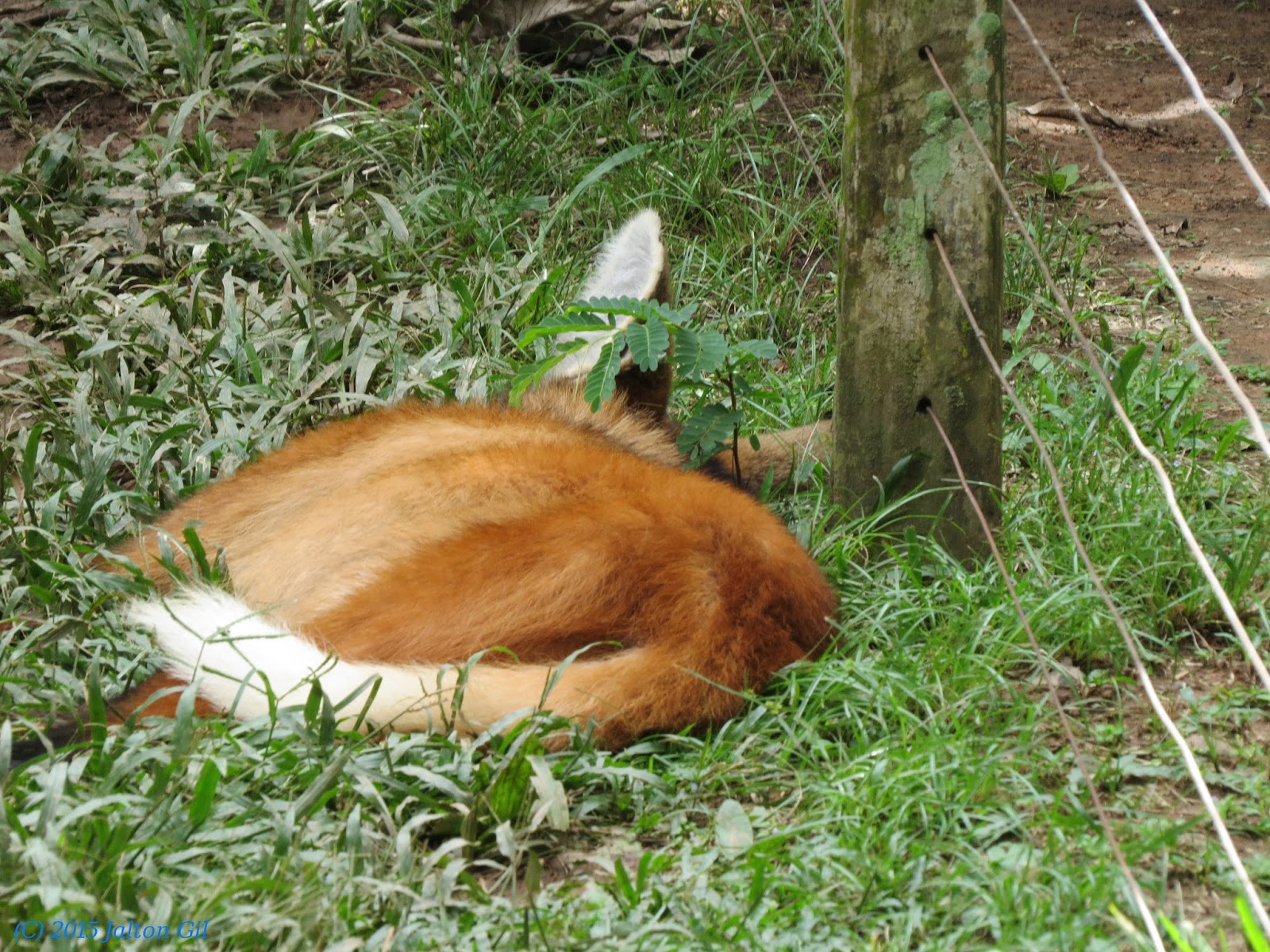 Mesmo deitado e de costas dá pra perceber que é o Chrysocyon brachyurus: o lobo-guará. Nem foi preciso a placa pra perceber.