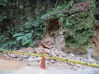 A entrada principal do parque estava parcialmente impedida para o tráfego de veículos. O motivo estava nesse desabamento bem próximo ao portão principal, que estava à meia porta mas liberada para os pedestres. Foi necessário contornar o Parque, ultrapassar o Museu do Açude e encontrar o portão do Açude da Solidão. Nem preciso dizer que na subida nesse domingo meu veículo só cruzou com dois carros descendo.