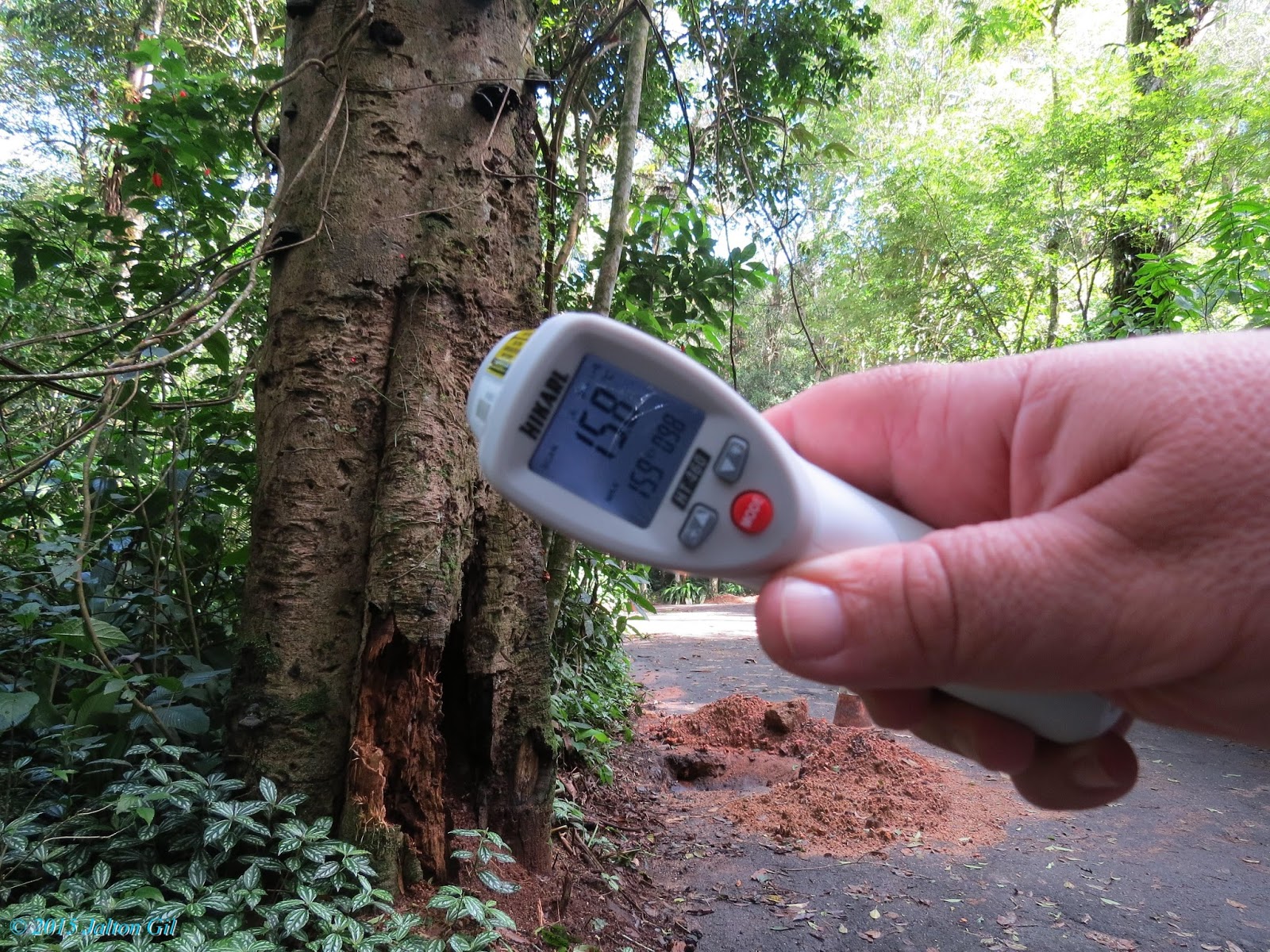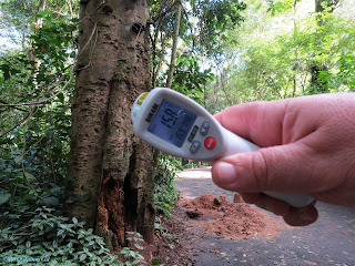 A primeira medição de temperatura de um caule. 15,8 graus Celsius. Foi uma medição que funcionou como um primeiro teste do equipamento. Pela foto o tronco parece ser o de uma árvore frondosa mas na verdade acima de cerca de 3 m de altura não há continuidade: está decepado (esta situação nada tem a ver com a dos cortes, registrada abaixo).