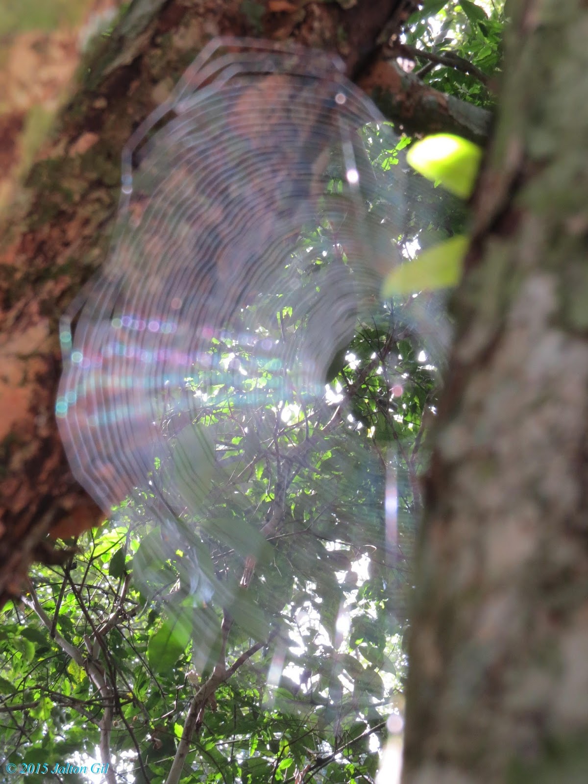 Uma teia de aranha formada entre troncos. As chuvas dos dias anteriores se refletiram no Parque.