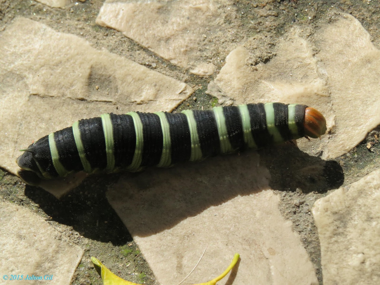 ) na calçada da Avenida Henrique Valadares, na Lapa, bairro do Centro do Rio de Janeiro. Esta lagarta costuma ser encontrada em figueiras-do-mato. É da Ordem